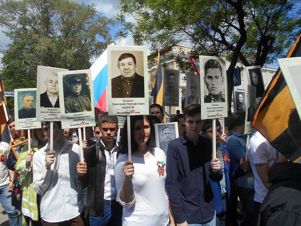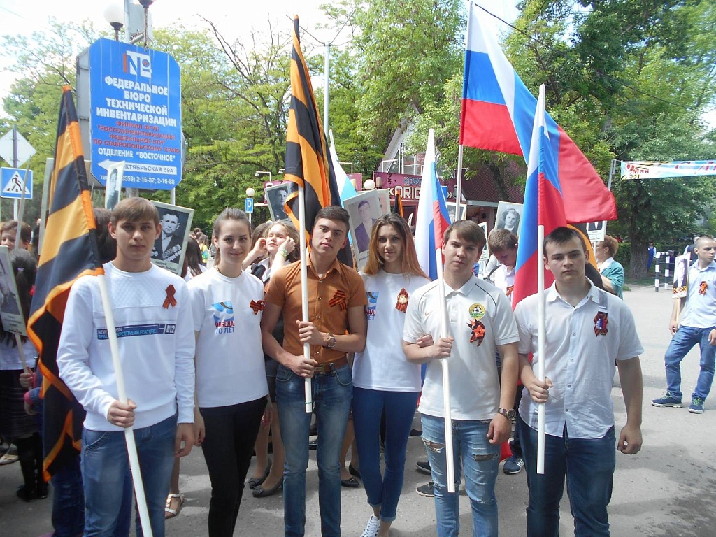 Вечером, 8 мая, в канун Дня Победы, на Центральной площади Будённовска на традиционную героическую поверку собрались несколько поколений горожан: ветераны, представители местной власти, военнослужащие и, конечно же, учащиеся образовательных учреждений и студенческая молодежь города. В знак неугасимой благодарности поколению Победителей молодёжь прошла через площадь с факелами и лампадами и выпустила в небо белые шары. А после минуты молчания будённовцы возложили венки и цветы к Вечному огню. 9 мая празднование началось с самого утра. По улицам города и Центральной площади прошла колонна "Бессмертного полка". Акция проводится в Будённовске второй год, и всё больше обучающихся нашего колледжа присоединяются к этому торжественному шествию.