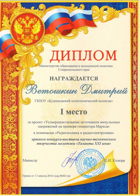 В апреле в г.Ставрополь проходил краевой конкурс-выставка научно-технического творчества молодежи «Таланты XXI века». Наш студент Ветошкин Дмитрий, обучающийся в 217 группе, занял I место за проект «Усовершенствование источников импульсных напряжений на примере генератора Макрса» в номинации «Электротехника и радиоэлектроника». А так же хочется отметить работу педагога Уткина М.С. подготовившего нашего победителя. 20 мая 2016 года в ГБОУ ДОД КЦРТДиЮ в г. Ставрополе проходила торжественная церемония награждения. Поздравляем наших победителей и желаем им дальнейших успехов!