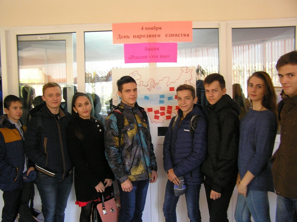 3 ноября в колледже состоялась акция для студентов «Россия – это МЫ», приуроченная к празднованию Дня народного единства. В мероприятии приняли участие 5 групп. Стикеры с пожеланиями для своей Родины мира, добра, процветания обучающиеся крепили на плакат с контурами России. В этот же день в городском Доме Культуры проходил фестиваль «Радуга дружбы». С музыкальными номерами в нем приняли участие обучающиеся колледжа Василий Зайцев(128 гр), Татьяна Цатурова (115 гр.), Григорий Хачатуров (413гр.). Огромное количество зрителей собралось в зале в этот день. Яркие наряды, песни, зажигательные танцы молодых исполнителей никого не оставили равнодушным. Гостей праздника приветствовали представители администрации города Буденновска: заместитель главы администрации С.Н.Куртасова и начальник отдела общественной безопасности В. Шихалев. На память о встрече всем участникам фестиваля были вручены подарки и дипломы.