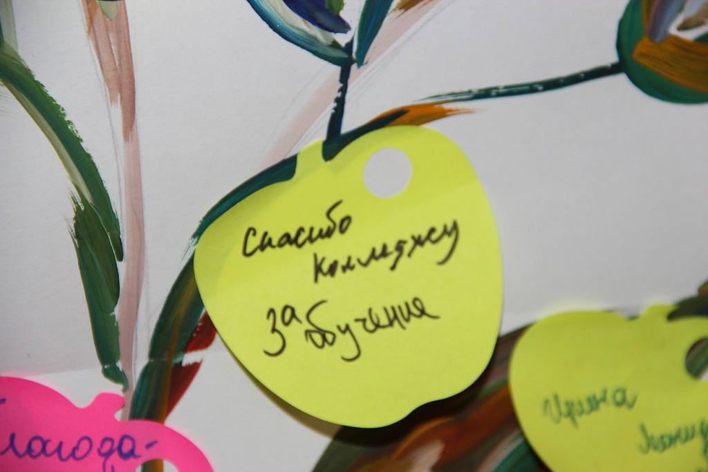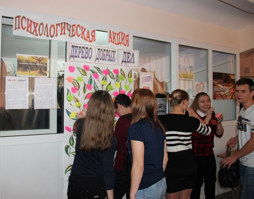 В понедельник, 14 ноября, в колледже проходила психологическая акция «Дерево добрых дел», посвященная международному Дню доброты. Целью мероприятия была возможность всем желающим высказать свое «Спасибо!» людям, которым они благодарны. В акции принимали участие не только студенты, но и преподаватели колледжа. Все время «Дерево добрых дел» не скучало. Кто-то выражал свою благодарность и признательность, а кто-то заинтересованно читал.