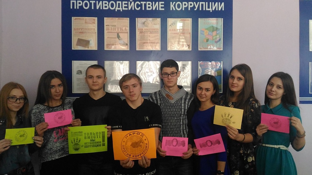 В международный день борьбы с коррупцией - 9 декабря 2016 года, в колледже были проведены мероприятия, направленные на формирование правовых знаний в области противодействия коррупции, антикоррупционных стандартов поведения: - классные часы «Способы противодействия коррупции»; - круглый стол для студентов 3 курса «Последствия коррупции»; - общеколледжное мероприятие, посвященное Международному дню противодействия коррупции; - акция «Вместе – против коррупции!»; - книжная выставка «Коррупция и ответственность за коррупционные деяния».