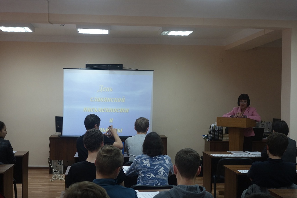 Руководитель кафедры гуманитарных дисциплин, преподаватель русского языка и литературы М.Н. Курилова поздравила студентов с этим знаменательным днём, отметила важность труда солунских братьев – Кирилла и Мефодия, для всего славянского мира.