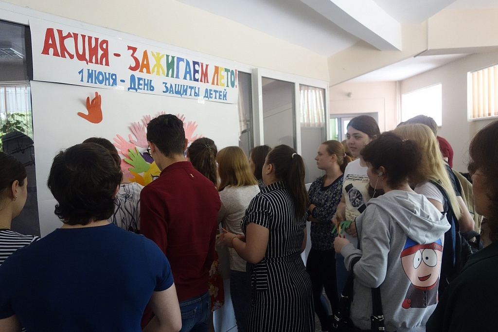 Сегодня, 1 июня, весь колледж участвовал в мероприятиях посвященных празднованию Дня защиты детей. На большой перемене, по неизменной традиции, проходила акция «Зажигаем лето». Всем желающим предлагалось вырезать из цветной бумаги ладошку, написать пожелания и приклеив ладошку к солнышку, сделать его теплым, летним лучиком. Все действия по созданию солнечных лучиков проходило оживленно и весело. Участвующие переживали, что им не хватит места, чтобы приклеить свою ладошку.