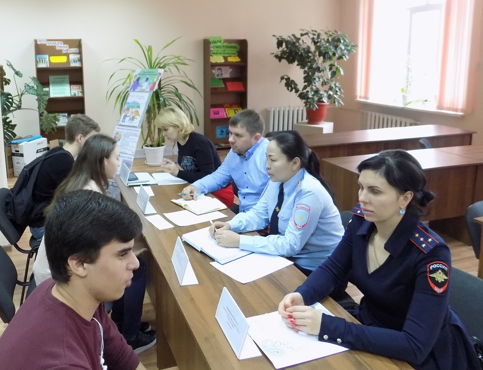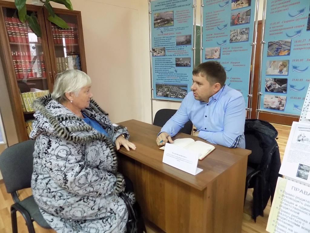 20 ноября с 11 часов в читальном зале колледже пять представителей различных учреждений оказывали консультативно-правовую помощь: помощник Буденновского межрайонного прокурора Шураева Татьяна Валерьевна, главный специалист сектора опеки и попечительства отдела образования администрации Буденновского муниципального района Жилкин Виктор Викторович, юрисконсульт управления труда и социальной защиты населения администрации Буденновского муниципального района Беликова Наталья Сергеевна, юрисконсульт ОМВД по Буденновскому району капитан внутренней службы Кацера Наталья Алексеевна, старший инспектор ОДН ОУУП и ПДН отдела МВД России по Буденновскому району майор полиции Аляева Гелена Петровна.