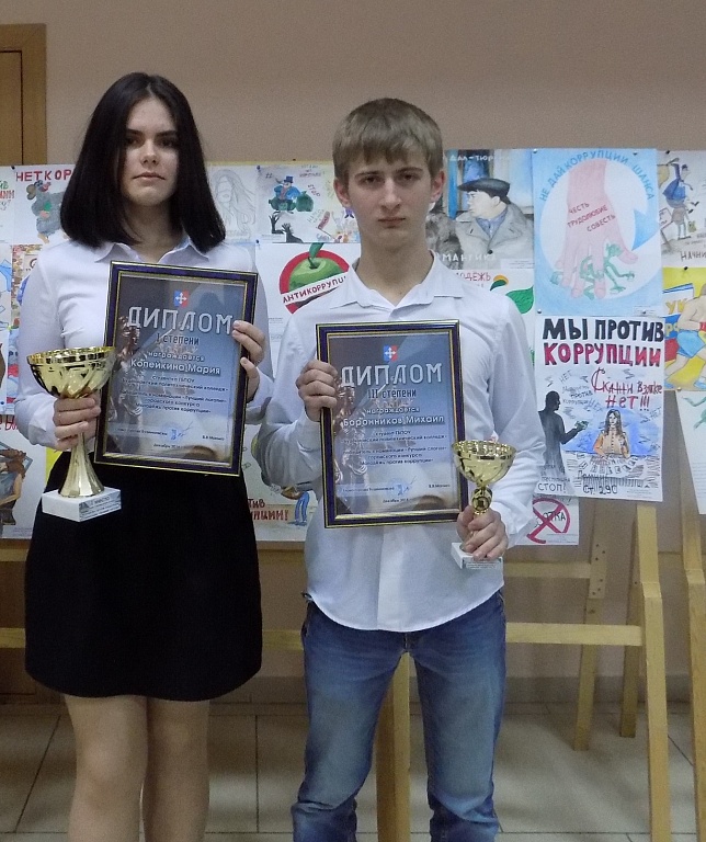 11 декабря в МАУ г.Буденновска «Дом культуры» состоялась выставка работ и награждение победителей конкурса «Молодежь против коррупции». Студенты Буденновского политехнического колледжа, подготовили конкурсные работы в номинациях: «сочинение», «логотип», «слоган», «листовка» и «рисунок». Победителям стали: в номинации «Лучший слоган» - Боронников Михайл (321 группа), в номинации «Лучший логотип» - Копейкина Мария (113 группа). Нашим победителям были вручены дипломы, кубки и памятные подарки. От всей души благодарим участников конкурса и поздравляем победителей.