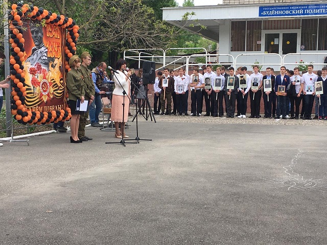 «Утро перед началом войны», которая завершилась исполнением вальса, а Гоженко Александра и Воронкова Валерия исполнили песни военных лет. Закончилось мероприятие торжественным шествием « Бессмертного полка» и исполнением песни « День Победы» всеми участниками торжественного мероприятия.