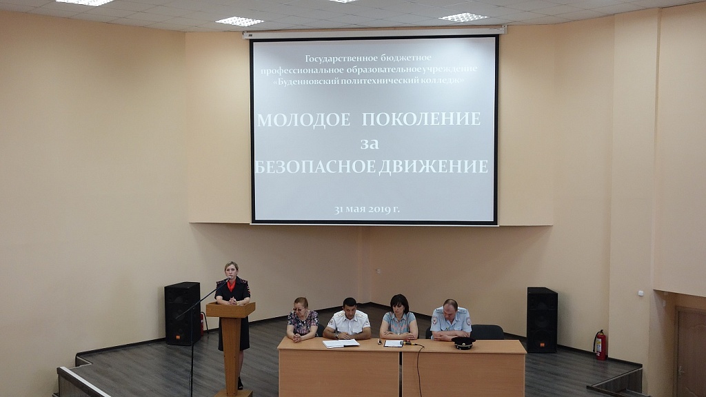 В рамках профилактической работы со студентами 31 мая 2019 года в колледже состоялся форум безопасности «Молодое поколение за безопасное движение!». В проведении мероприятия приняли участие представители органов и учреждений системы профилактики: начальник ОМВД России по Буденновскому району полковник полиции И. И. Уско, врио начальника отдела ГИБДД ОМВД России по Буденновскому району капитан полиции Р. В. Калабеков, председатель общественного совета при ОМВД России по Буденновскому району Н. Н. Чурсинова, ВРИО начальника ОДН ОУУП и ПДН отдела МВД России по Буденновскому району майор полиции А. Н. Бегларян, сотрудник УУП и ПДН отдела МВД России по Буденновскому району капитан полиции М. А. Рябоконов, инспектор ПБДД ОГИБДД ОМВД России по Буденновскому району лейтенант полиции Е. В. Иванова, сотрудники МУГ БМР «Спасатель».