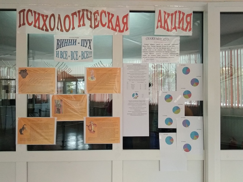 В канун Международного Дня Добра членами психологического кружка «Доверие» проводилась психологическая акция «Винни – Пух и все, все, все!». Целью которой было расширение представлений о самом себе у участников акции. Задача стояла в выборе одного наиболее симпатичного героя из истории про Винни-Пуха и проголосовать за него.