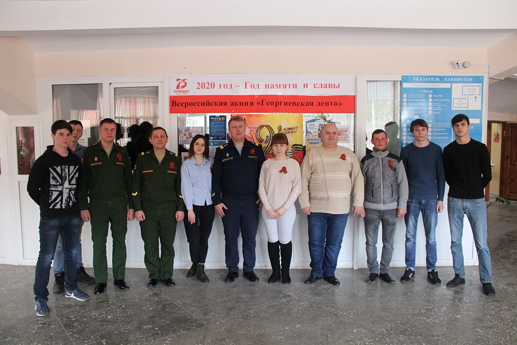 2020 год был объявлен Годом памяти и славы, в связи с юбилейной 75-й годовщиной со Дня Победы в Великой Отечественной войне. 11 февраля в нашем колледже стартовала акция «Георгиевская лента». Волонтеры и студенческий актив Буденновского политехнического колледжа, в рамках работы «Штаба Победы Прикумья», запустили акцию «Георгиевская ленточка», добровольцы раздавали студентам и преподавателям ленточки и рассказывали о правилах ее ношения. Целью акции является выражение нашего уважения к ветеранам, дань памяти павшим на поле боя, благородность людям, отдавшим жизнь ради победы нашей Родины. Напомним, что георгиевская лента – это лента с чередующимися тремя черными и двумя оранжевыми полосами равной ширины, по ее краям идет узкий оранжевый кант. Данная цветовая гамма использовалась в создании разных наград и применение ее – это ассоциация с символом доблести и славы.