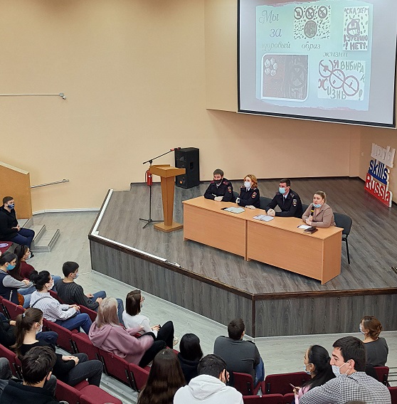 26 февраля 2021 года состоялась встреча студентов 1-2 курсов колледжа с представителями ОМВД России по Буденновскому району и МБУ «Центр по работе с молодежью Буденновского района» по вопросам недопущения употребления наркотических средств и психотропных веществ, профилактики табакокурения, распития спиртосодержащих напитков, предупреждения дорожно-транспортных происшествий и травматизма несовершеннолетних.