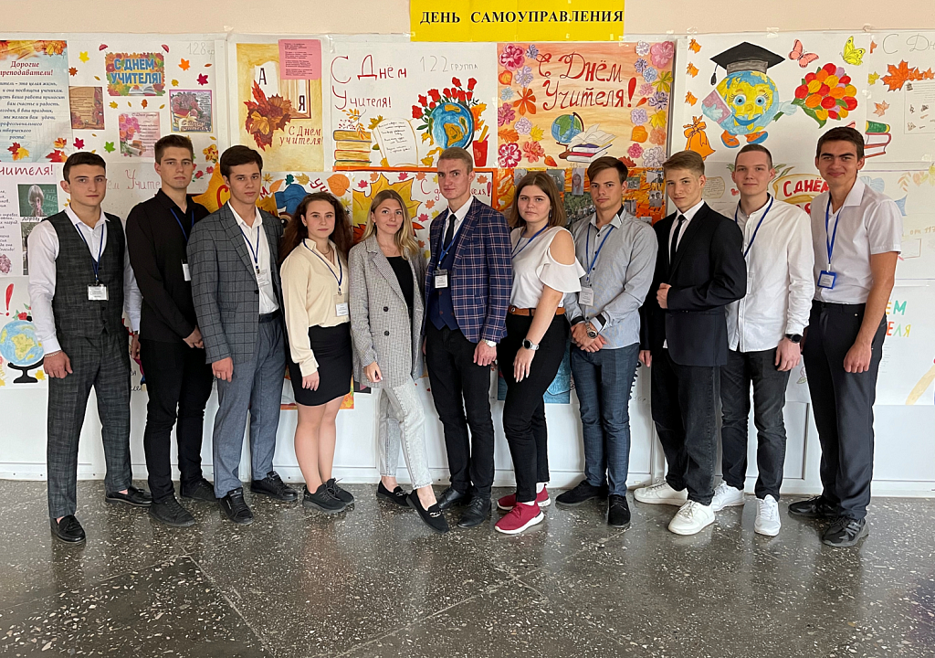 5 октября во всей стране отмечают праздник – День учителя. В нашем колледже есть давняя традиция – в День учителя устраивать день самоуправления, когда пары ведут не преподаватели, а студенты. В этот день были назначены дублеры кураторов и преподавателей, а также дублеры администрации колледжа. У каждого дублера были свои обязанности: осуществлять контроль за проведением пар, за дисциплиной в колледже и на прилегающей территории, выполнением уборок в кабинетах, обеспечить безопасность студентов, с которыми они отлично справлялись.В актовом зале для всех педагогов студентами 413 группы был организован праздничный концерт, в нём исполнялись танцевальные номера, в том числе национальные, душевные стихотворения и музыкальные номера, а также веселые инсценировки. Директор колледжа Бабич Марина Владимировна поздравила всех сотрудников с праздником и вручила им грамоты за ответственное выполнение служебных обязанностей, добросовестный труд, преданность избранной профессии, многолетнюю плодотворную работу в системе образования Ставропольского края.