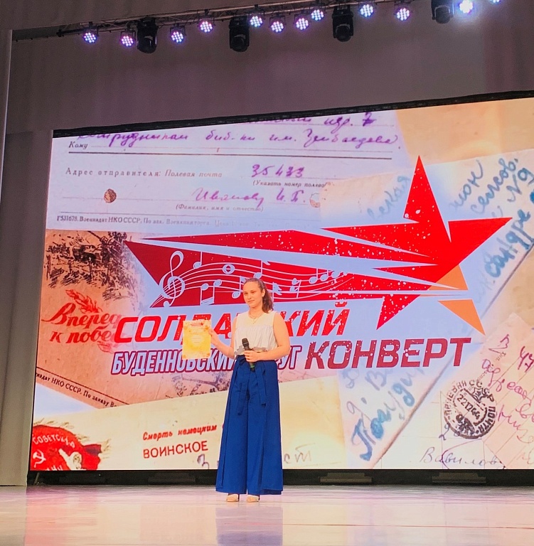 1 декабря 2022 года в Доме Культуры состоялся городской фестиваль-конкурс патриотической песни «Солдатский конверт». Песни военных лет, сколько прекрасных и незабываемых композиций. Они как люди, у каждой есть своя биография, своя судьба. Разные, непохожие, близкие и далекие. Именно такие песни звучали в этот день. Конкурсанты смогли удивить не только зрителей, но и самых искушенных экспертов. Они исполнили народные патриотические песни, произведения из кинофильмов о войне, а также хиты, которые в России традиционно звучат 9 Мая. Студенты нашего колледжа Алена Чурикова ( 216 группа) и Евгений Тютюнник ( 417 группа) приняли участие и исполнили патриотические песни. Всем участникам фестиваля были вручены благодарственные письма, а почетное 1 место занял Евгений Тютюнник в возрастной категории 18-25 лет Фестиваль объединил творческую молодежь на общих ценностях и сохранения истории событий Великой Отечественной войны через песни.