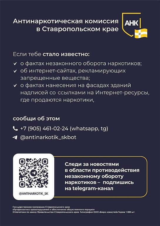 Если тебе стало известно: - о факте незаконного оборота наркотиков; - об интернет-сайтах, рекламирующих запрещенные вещества; - о фактах нанесения на фасадах зданий надписей со ссылками на Интернет-магазины по продаже запрещенных веществ; - об очагах произрастания дикорастущих наркосодержащих растений - ⠀ сообщи об этом: ⠀ +7 (905) 461-02-24 (whatsapp, tg) Любая информация будет проверена. Ни одно обращение не останется без внимания. Подпишись на telegram-канал t.me/antinarkotik_sk и бот обратной связи t.me/antinarkotik_skbot Здесь размещается актуальная информация о вреде потребления наркотиков и последствий участия в их незаконном обороте. Возможно, ты спасешь чью-то жизнь. Наркоманию можно победить только совместными усилиями.
