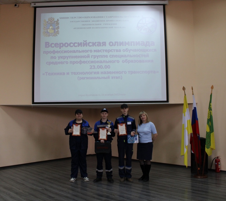24 ноября 2023 года, на базе Буденновского политехнического колледжа состоялось закрытие регионального этапа Всероссийской олимпиады профессионального мастерства обучающихся по укрупненной группе специальностей среднего профессионального образования «Техника и технология наземного транспорта». Олимпиада проводилась с целью повышения качества профессиональной подготовки специалистов среднего звена. На церемонии закрытия с напутственными словами к участникам олимпиады обратился председатель жюри ,главный инженер АО « Прасковея» депутат Думы Буденновского муниципального округа Бережняк Александр Николаевич. И в завершении церемонии консультант отдела профобразования министерства образования Ставропольского края Кривченко Оксана Сергеевна наградила победителей олимпиады дипломами министерства образования Ставропольского края и вручила памятные подарки, а так же вручила кубок победителю.