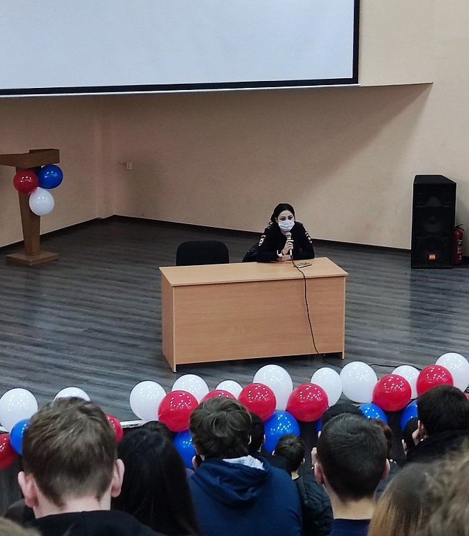 В рамках проведения в колледже Единого дня профилактики правонарушений 21 декабря 2023 г. состоялась встреча студентов колледжа с представителем учреждения системы профилактики - инспектором ОДН ОУУП и ПДН отдела МВД России «Буденновский» лейтенантом полиции Ханагаевой Жанной Арутюновной. В преддверии зимних каникул мероприятие направлено на предотвращение правонарушений и преступлений, а также всех видов детского травматизма, в том числе и дорожно-транспортного.Заместитель директора по ВР и СВ Зубаха С. А. совместно с инспектором настоятельно рекомендовали соблюдать правила поведения на улице, в общественных местах и местах массового отдыха в новогодний период. Жанна Арутюновна привела статистические данные и примеры из жизни, иллюстрирующие несоблюдение правил безопасности, подняла вопрос употребления спиртных напитков и табака, пагубности этих пристрастий для молодежи, напомнила об уголовной и административной ответственности за совершение преступлений и правонарушений в сфере незаконного оборота наркотических средств, о методах агитации и вербовки молодежи в свои ряды представителями запрещенных радикальных организаций. Уделили внимание разъяснению правил безопасного использования пиротехнических изделий, соблюдению правил дорожного движения, использовании световозвращающих элементов на одежде, мерах предосторожности на льду рек и озёр.