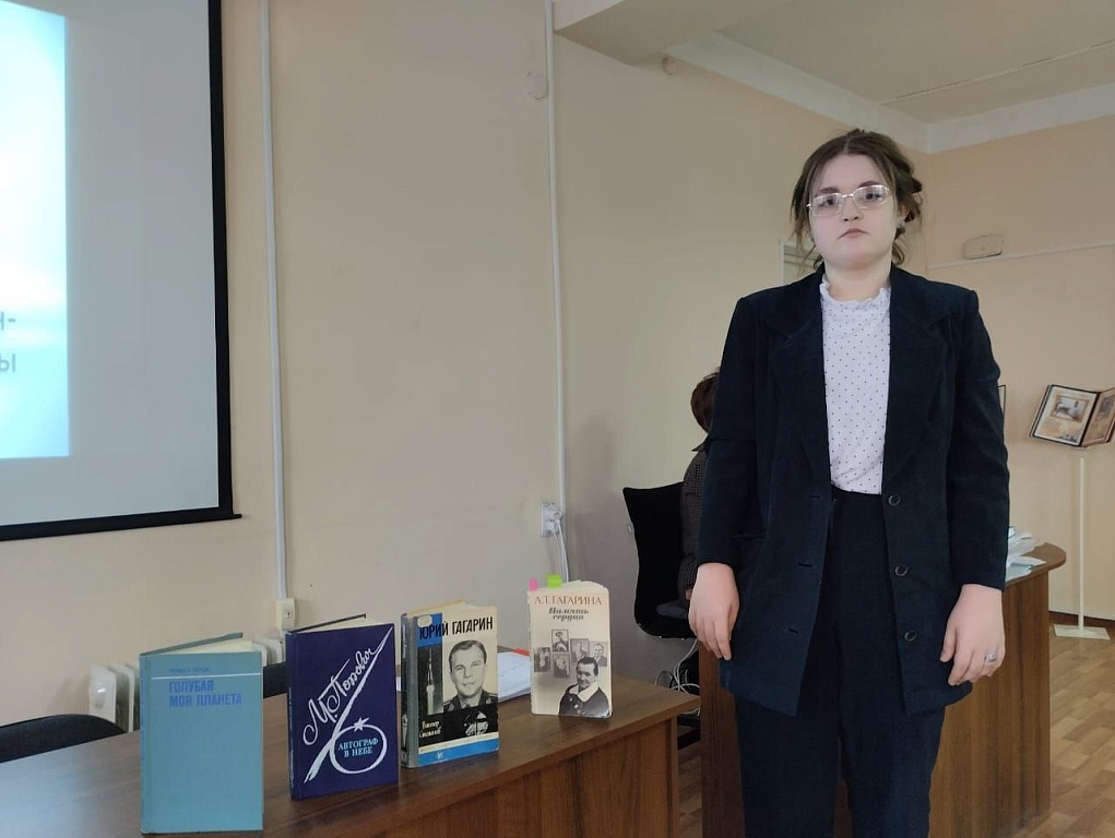 Своими впечатлениями о прочитанных книгах поделилась Зимина Анна группа 113. Были представлены книги В. Степанова «Юрий Гагарин», книга-воспоминание А.Т. Гагариной « Память сердца», а также книги М. Попович «Автограф в небе», Германа Титова «Голубая моя планета».
