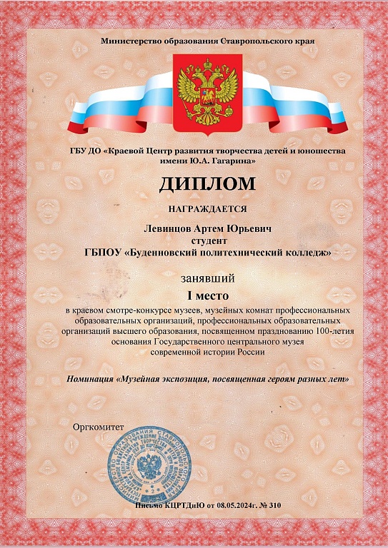 ГБУ ДО «Краевым Центром развития творчества детей и юношества имени Ю.А. Гагарина» подведены итоги краевого смотра – конкурса музеев, музейных комнат профессиональных образовательных организаций, профессиональных образовательных организаций высшего образования, посвященных празднованию 100- летия основания Государственного центрального музея современной истории России. Среди победителей Конкурса обучающийся 217 группы нашего колледжа Левинцов Артем, занявший 1 место в номинации «Музейная экспозиция, посвященная героям разных лет» и руководитель музея, педагог – библиотекарь Гринько Екатерина Викторовна, занявшая 2 место в номинации «Музейная экскурсия».