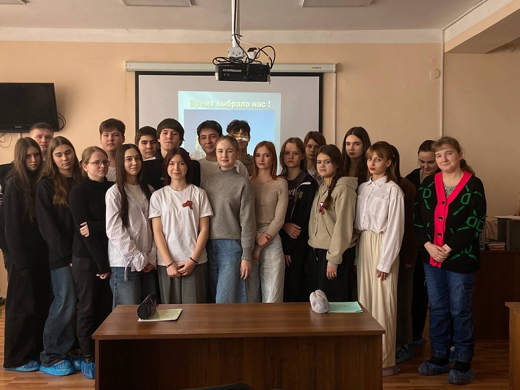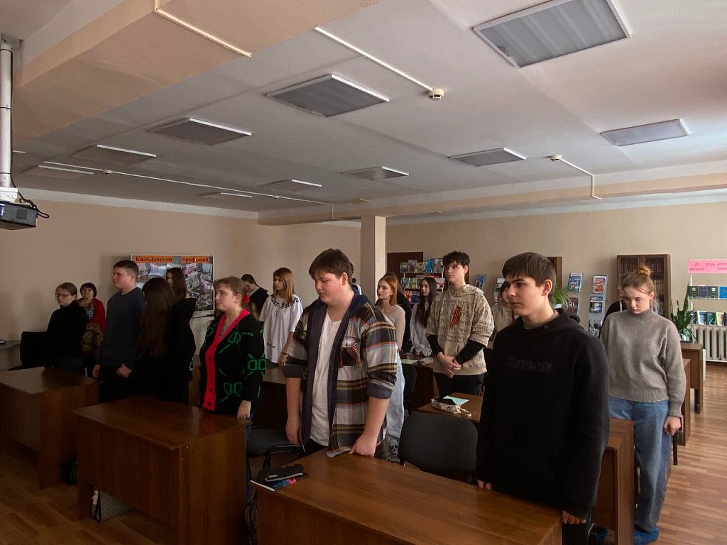 Для обучающихся 115 группы в читальном зале библиотеки колледжа прошел час Мужества «Время выбрало нас». Ведущие Петрушкин Станислав и Колодяжная Анастасия, обучающиеся 213 группы, напомнили о первых днях специальной военной операции 2022 года , когда внуки народа-победителя, внуки и правнуки героев Великой Отечественной войны снова поднялись на защиту нашей Родины.