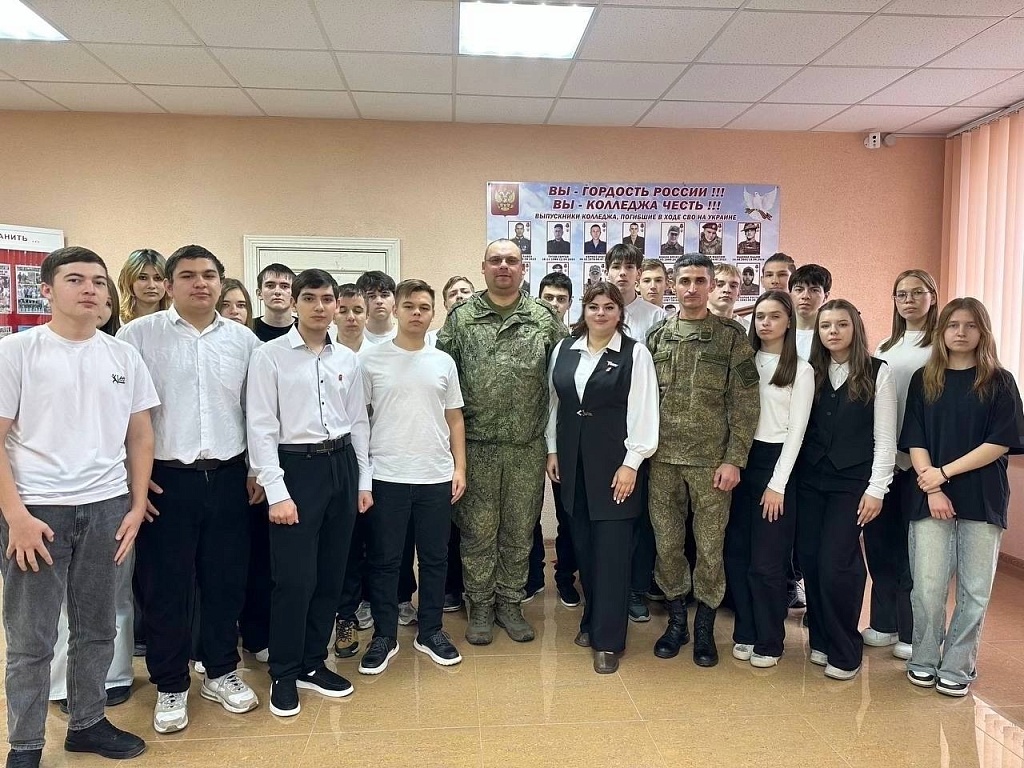Сегодня в колледже прошла «Классная встреча» с военнослужащими, участниками специальной военной операции, посвященное патриотическому воспитанию и самому важному – мужеству, долгу и любви к Родине.