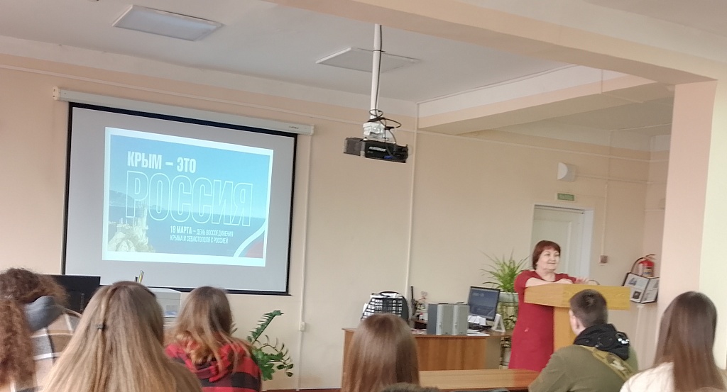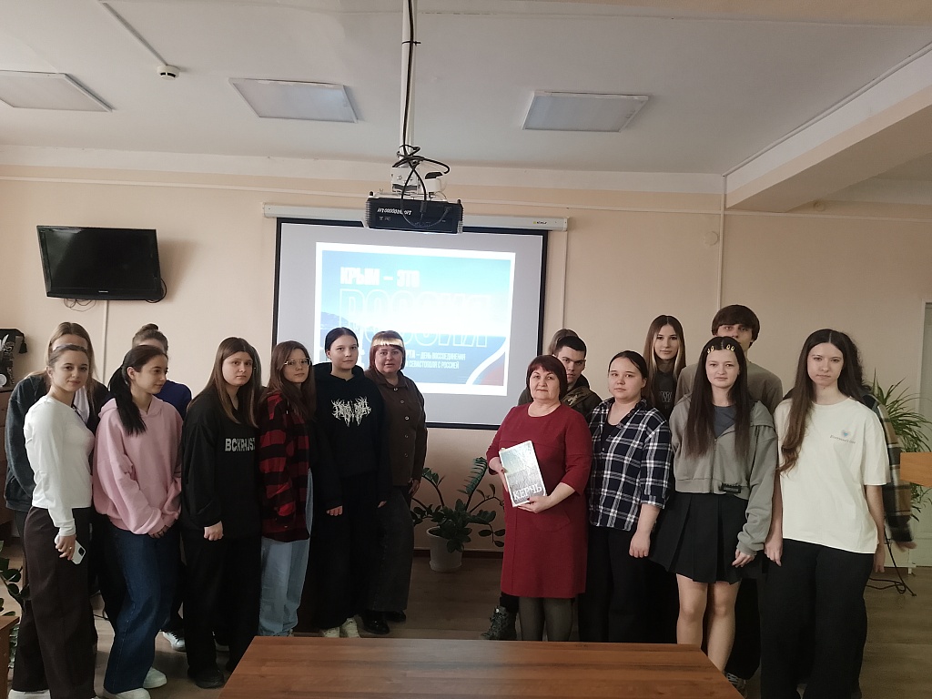 Мероприятие, посвященное чествованию данного события, прошло в библиотеке нашего колледжа. Педагог-библиотекарь Екатерина Викторовна Гринько познакомила студентов группы 212 с историей возникновения, политическими переменами и развитием Крыма, начиная с XIII века и заканчивая современностью. Ребятам были продемонстрированы презентации и видеоролики, зачитаны стихи, проведен экскурс по самым живописным и археологически важным уголкам полуострова. В ходе обсуждения, юноши и девушки сделали вывод, что возвращение Крыма на свою Родину – это восстановление исторической справедливости и единства русского народа.