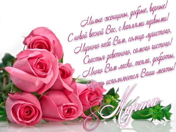 Милые женщины, дорогие коллеги! Примите мои самые теплые поздравления с Международным женским днем 8 марта! В этот праздничный весенний день от всей души желаю вам, счастья, любви, здоровья, неувядающей красоты, благополучия! Пусть наступившая весна станет для вас источником обновления, придаст свежие силы, энергию и вдохновит на создание и успешную реализацию дальнейших профессиональных и жизненных планов! Пусть вас всегда окружают самые близкие и родные люди, рядом будут верные друзья, а ваши глаза светятся от счастья как можно чаще!