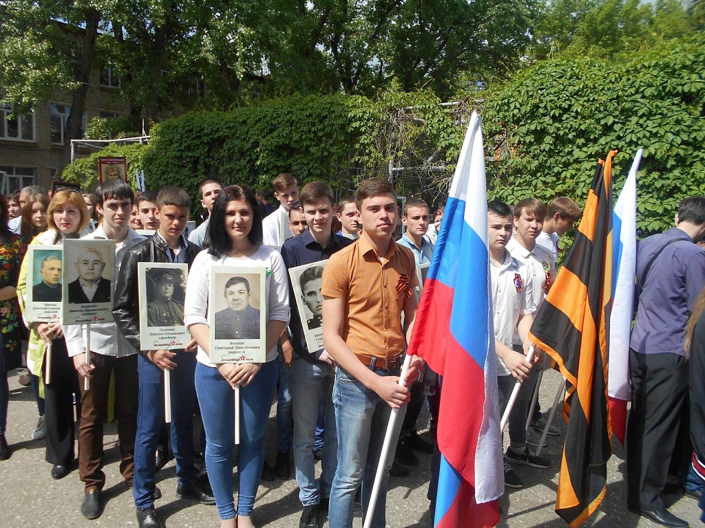 Вечером, 8 мая, в канун Дня Победы, на Центральной площади Будённовска на традиционную героическую поверку собрались несколько поколений горожан: ветераны, представители местной власти, военнослужащие и, конечно же, учащиеся образовательных учреждений и студенческая молодежь города. В знак неугасимой благодарности поколению Победителей молодёжь прошла через площадь с факелами и лампадами и выпустила в небо белые шары. А после минуты молчания будённовцы возложили венки и цветы к Вечному огню. 9 мая празднование началось с самого утра. По улицам города и Центральной площади прошла колонна "Бессмертного полка". Акция проводится в Будённовске второй год, и всё больше обучающихся нашего колледжа присоединяются к этому торжественному шествию.