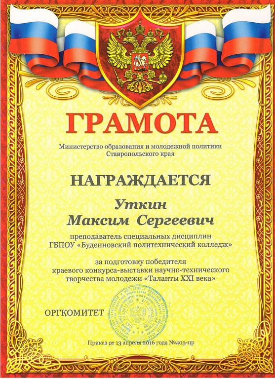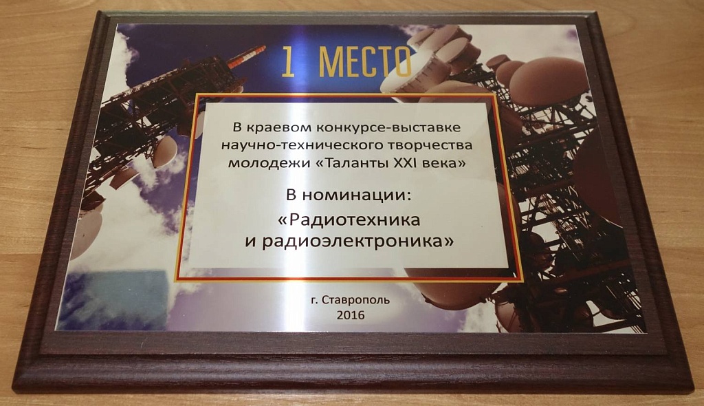 В апреле в г.Ставрополь проходил краевой конкурс-выставка научно-технического творчества молодежи «Таланты XXI века». Наш студент Ветошкин Дмитрий, обучающийся в 217 группе, занял I место за проект «Усовершенствование источников импульсных напряжений на примере генератора Макрса» в номинации «Электротехника и радиоэлектроника». А так же хочется отметить работу педагога Уткина М.С. подготовившего нашего победителя. 20 мая 2016 года в ГБОУ ДОД КЦРТДиЮ в г. Ставрополе проходила торжественная церемония награждения. Поздравляем наших победителей и желаем им дальнейших успехов!