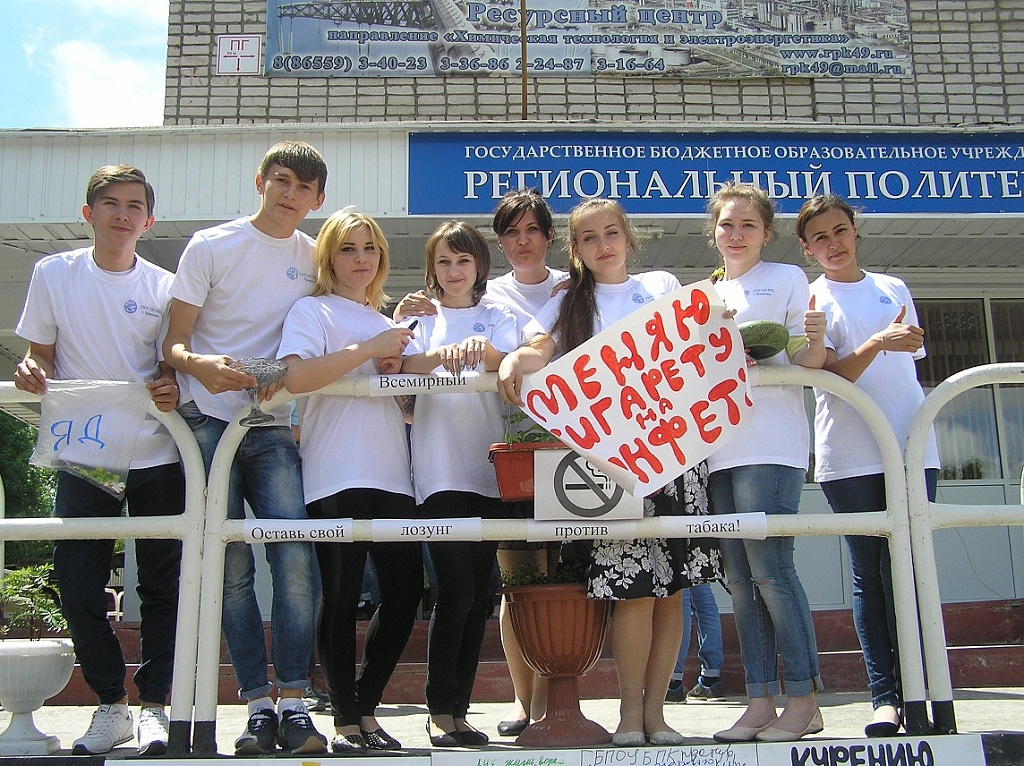 Ежегодно 30 мая в Международный день отказа от табака в колледже проводится акция «Меняем сигарету на конфету!». Организаторами акции стали инициативные ребята из студенческого совета. На большой перемене играла музыка, председатель Барыльникова Анастасия призывала всех отказаться от этой пагубной привычки и поменять сигарету на конфету хотя бы в этот день. В этот же день прошел конкурс плакатов, в котором отличились 115, 116 и 217 группы. Основной целью этих мероприятий является привлечение внимания студентов к собственному здоровью. Ведь эта вредная привычка губит человека изнутри.