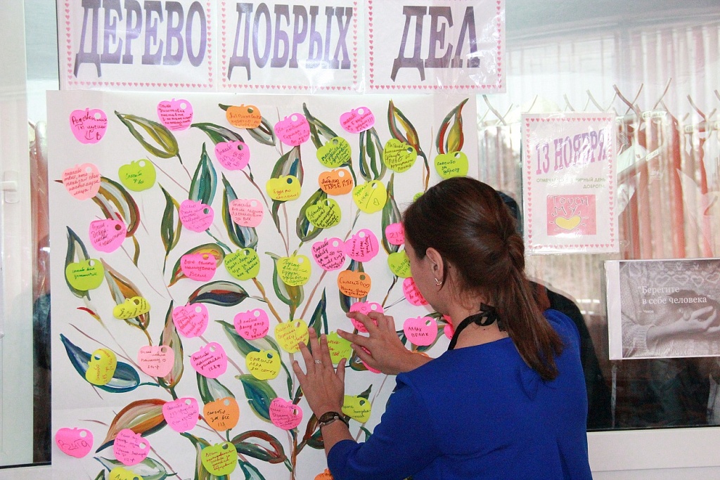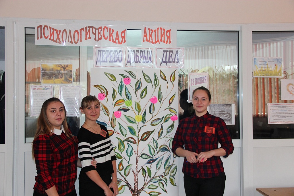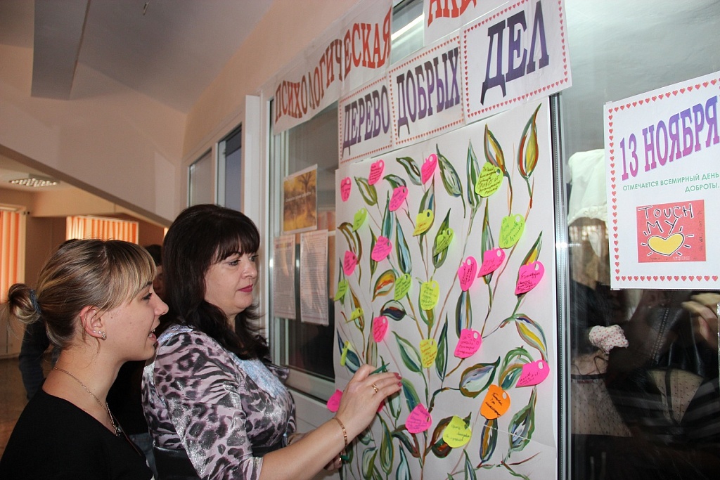 В понедельник, 14 ноября, в колледже проходила психологическая акция «Дерево добрых дел», посвященная международному Дню доброты. Целью мероприятия была возможность всем желающим высказать свое «Спасибо!» людям, которым они благодарны. В акции принимали участие не только студенты, но и преподаватели колледжа. Все время «Дерево добрых дел» не скучало. Кто-то выражал свою благодарность и признательность, а кто-то заинтересованно читал.