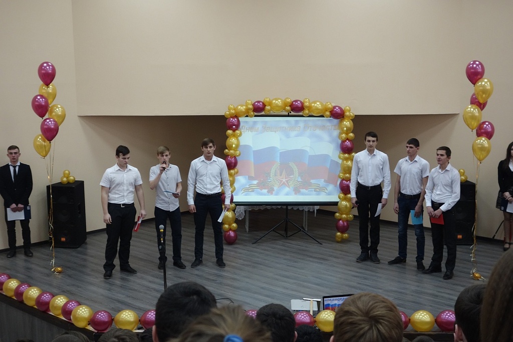 В канун дня защитника Отечества в колледже прошло общеколледжное мероприятие «Героям посвящается…» подготовленное 220 группой, куратор Сычева О.Н. На торжественном мероприятии присутствовали почетные гости колледжа, военнослужащие 78 бригады материально технического обеспечения Южного военного округа. Которые пожелали нашим юношам успехов в учебе и хорошей службы в рядах российских войск.