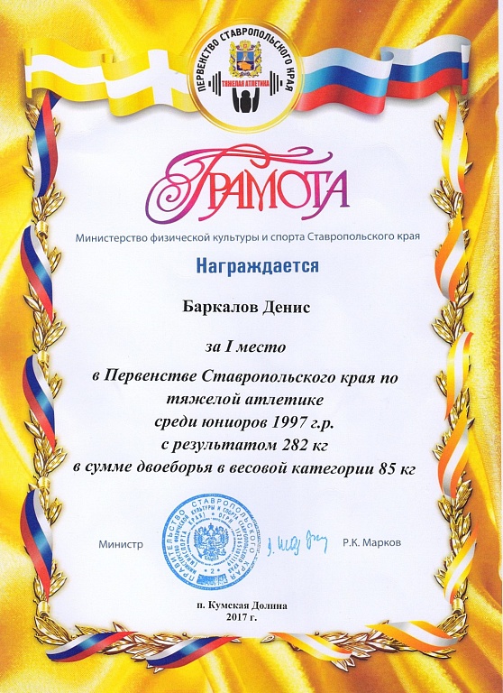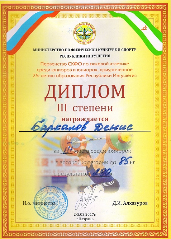 Со 2 – 5 марта 2017 г. В г. Назрань проходило Первенство СКФО по тяжелой атлетике среди юниоров и юниорок, приуроченное 25- летию образования Республики Ингушетия. Наш студент Баркалов Денис в весовой категории 85 кг с результатом 290 кг. Занял почетное 3 место и был награжден медалью и дипломом 3 степени. В п. Кумская Долина проходило первенство Ставропольского края по тяжелой атлетике среди юниоров 1997 г.р. С результатом 282 кг в сумме двоеборья в весовой категории 85 кг. Денис занял 1 место!!! Администрация и студенческий состав колледжа поздравляет Дениса с победами и желает дальнейших успехов и конечно неоднократных побед!