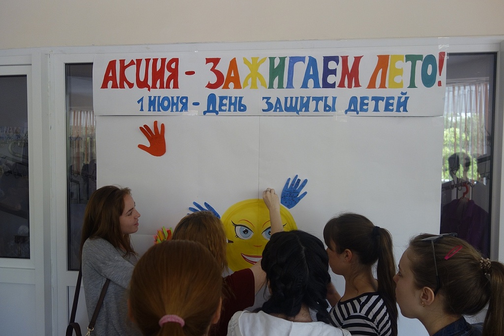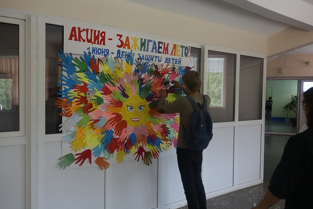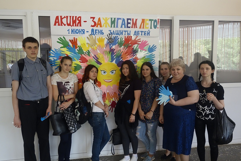 Сегодня, 1 июня, весь колледж участвовал в мероприятиях посвященных празднованию Дня защиты детей. На большой перемене, по неизменной традиции, проходила акция «Зажигаем лето». Всем желающим предлагалось вырезать из цветной бумаги ладошку, написать пожелания и приклеив ладошку к солнышку, сделать его теплым, летним лучиком. Все действия по созданию солнечных лучиков проходило оживленно и весело. Участвующие переживали, что им не хватит места, чтобы приклеить свою ладошку.