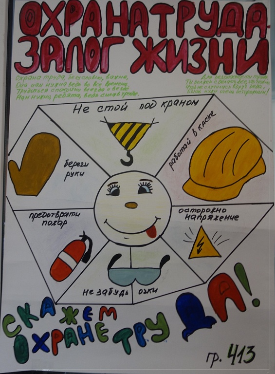 Мероприятия в области охраны труда в колледже не ограничивается обязательными учебными занятиями по охране труда и безопасности жизнедеятельности. Ежегодно в колледже 28 апреля отмечается Всемирный День охраны труда, а так же в октябре месяце проводится день охраны труда. В этом году это мероприятие прошло 26 октября. В рамках праздника охраны труда, прошли семинары, викторины и конкурсы по темам, связанные с охраной труда и безопасностью жизнедеятельности. Кураторами и мастерами групп проводились беседы, классные часы, а так же проводился конкурс стенгазет на тему охраны труда. Лучшие стенгазеты выполнили обучающиеся групп 115, 116, 217.
