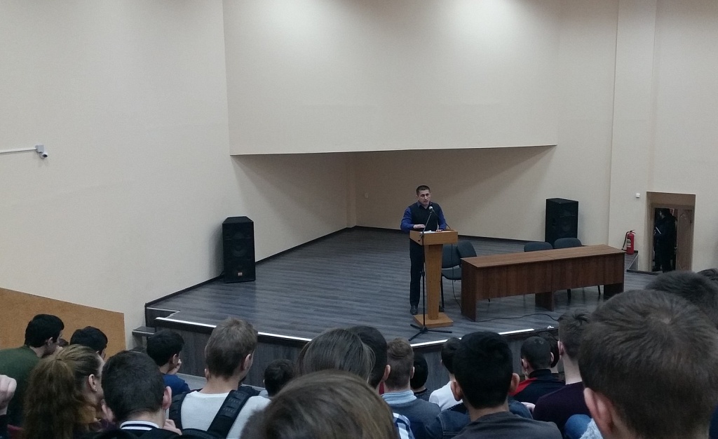 В рамках месячника оборонно – массовой и военно–патриотической работы 9 февраля 2018 года перед студентами 1 курса выступил старший помощник начальника отдела подготовки и призыва граждан на военную службу военного комиссариата города Буденновска и Буденновского района Ризаханов З. М..