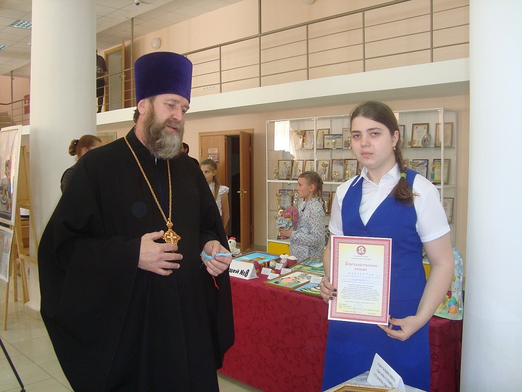 В связи с проведением Пасхального фестиваля Свято-Крестового благочиния Георгиевской епархии РПЦ «Светлое Христово Воскресенье» 10 апреля в ДК города Буденновска состоялась выставка прикладного искусства на тему православной культуры и праздника Пасхи. В выставке приняли участие образовательные учреждения города, от нашего колледжа свои работы предоставила студентка 213 группы Сысоева Татьяна.