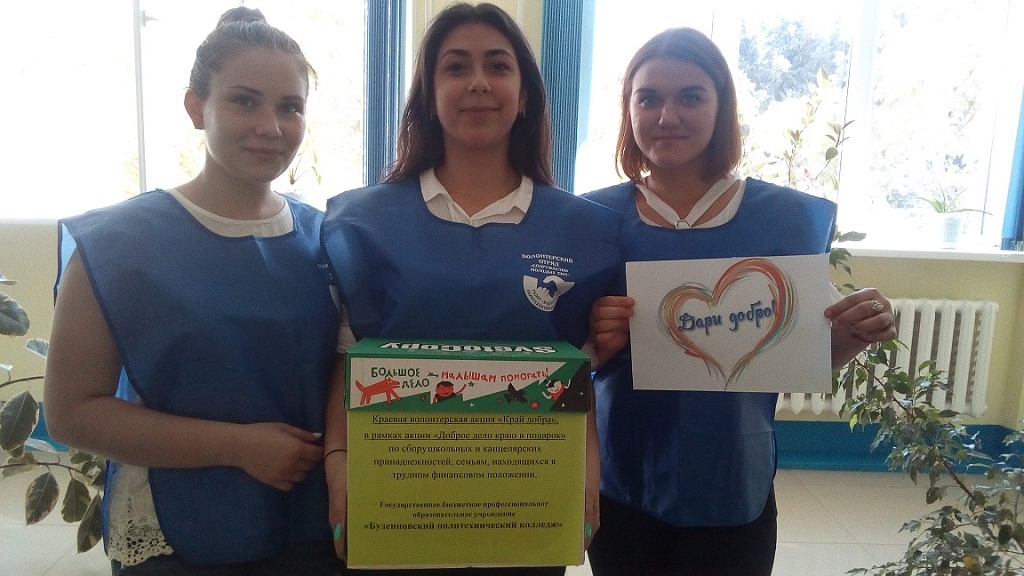 В Буденновском районе прошла волонтерская акция «Край добра», в рамках краевой акции «Доброе дело краю в подарок» по сбору школьных и канцелярских принадлежностей, семьям находящихся в трудной жизненной ситуации. Активное участие приняли волонтеры Буденновского политехнического колледжа, они не остались равнодушными к чужим проблемам и организовали сбор канцелярских товаров, в которых так нуждаются дети, каждый студент внес свою лепту в благое дело, ведь великодушие, отзывчивость и доброта делают нашу жизнь лучше. Все собранные товары были переданы в «Буденновский СРЦН «Искра»