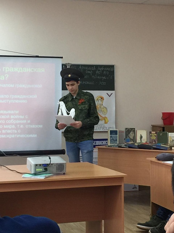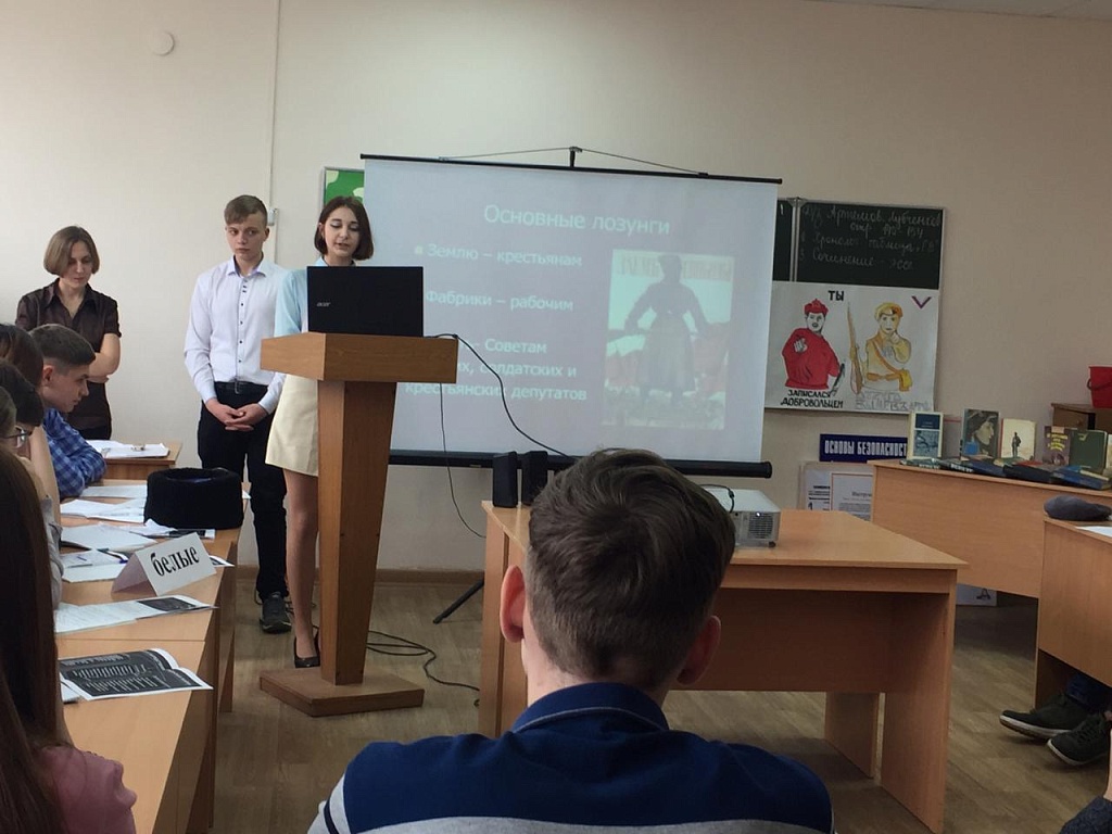 В ходе занятия обучающиеся подготовили доклады с презентациями о значимых деятелях гражданской войны, выяснили предпосылки и особенности Гражданской войны в России, рассмотрели расстановку противоборствующих сил в гражданском конфликте, их социальный состав и политические ориентации, последствия для судьбы страны в XX веке.