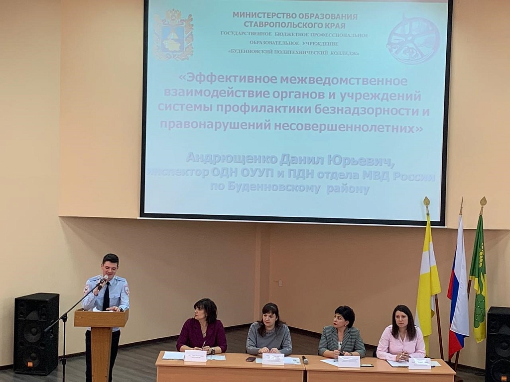 С приветственным словом к участникам семинара обратилась директор Буденновского политехнического колледжа Бабич Марина Владимировна и познакомила участников семинара с опытом работы учреждения в рамках межведомственного взаимодействия по профилактике социальных рисков и правонарушений. Буримова Марина Анатольевна, заместитель главы администрации Буденновского муниципального района подробно остановилась на вопросах межведомственного взаимодействия как условия эффективности профилактической работы. Крутоголова Алла Григорьевна, ответственный секретарь комиссии по делам несовершеннолетних и защите их прав Буденновского муниципального района, рассказала о координирующей роли комиссии по делам несовершеннолетних и защите их прав Буденновского муниципального района в организации межведомственного взаимодействия органов и учреждений системы профилактики. О состоянии преступности и правонарушений несовершеннолетних, анализе причин и условий, способствующих совершению ими противоправных действий, а также пути решения проблемы были подробно освещены в докладе Андрющенко Даниила Юрьевича, инспектора ОДН ОУУП и ПДН отдела МВД России по Буденновскому району. Иванова Елена Васильевна, инспектор ПБДД ОГИБДД ОМВД России по Буденновскому району в своем выступление рассказала о профилактике дорожно-транспортного травматизма среди молодежи.О молодежных инициативах, направленных на профилактику асоциальных явлений среди обучающихся, рассказала участник семинара директор МБУ « Центр по работе с молодежью Буденновского района. Бессмертная Евгения Вячеславовна.