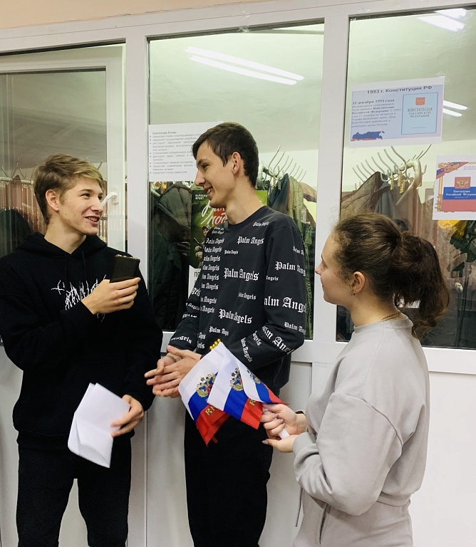 Наши студенты в рамках акции «Наша Конституция — наш закон» брали интервью у студентов и преподавателей, задавая им вопросы о конституции. Свои знания смогли проверить все желающие. По окончанию всем участникам акции выдавались флажки Российской Федерации.