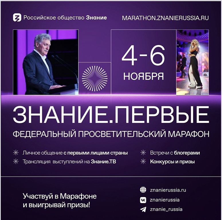 В рамках плана совместных проектов Министерства просвещения России и Российского общества «Знание» в 2023 году в период с 4 по 6 ноября 2023 г. пройдет Федеральный просветительский марафон Знание.Первые , который соберет более 15 тысяч участников и будет транслироваться в прямом эфире на многомиллионную онлайн-аудиторию по всей стране.