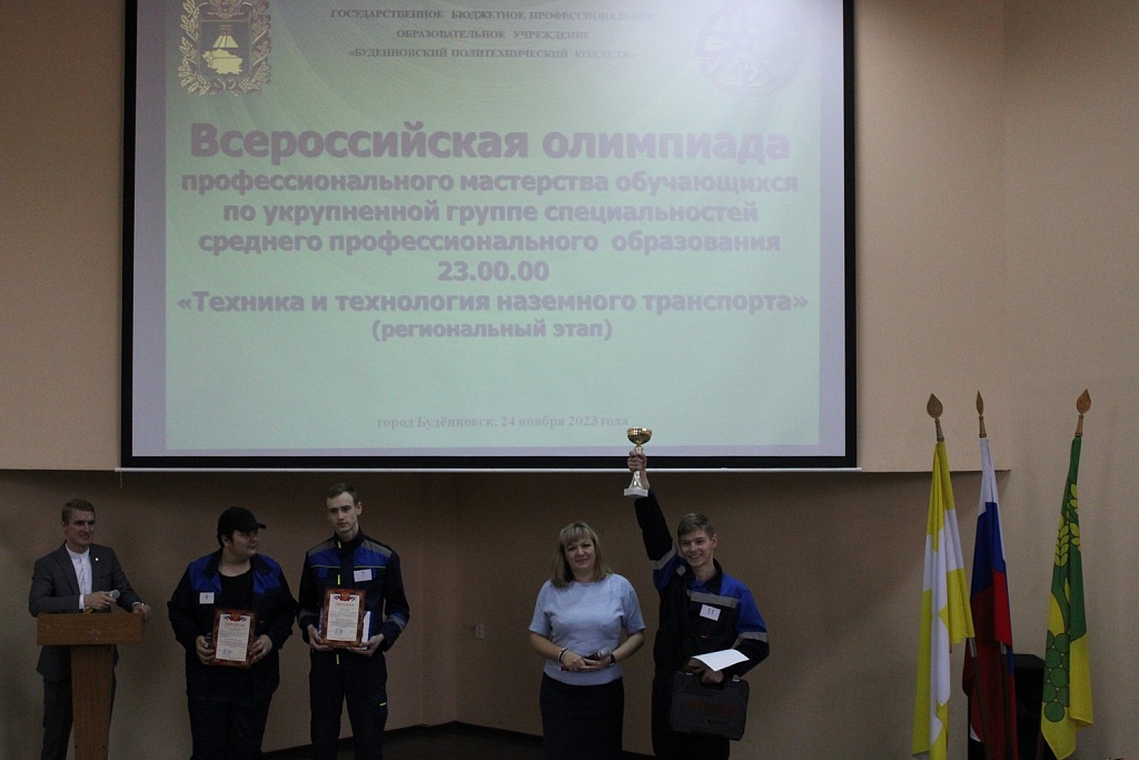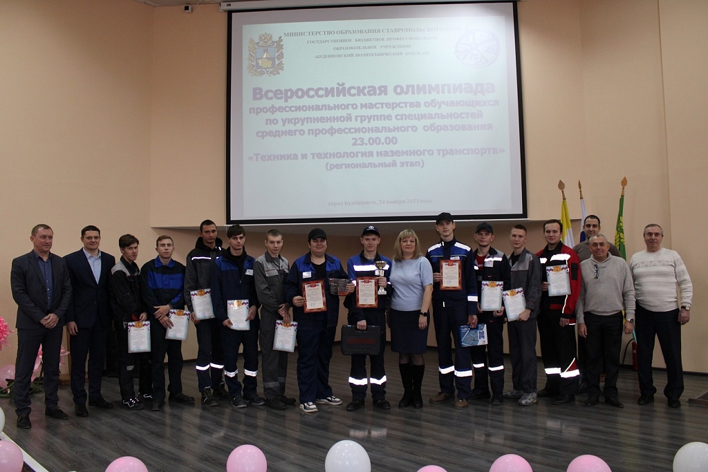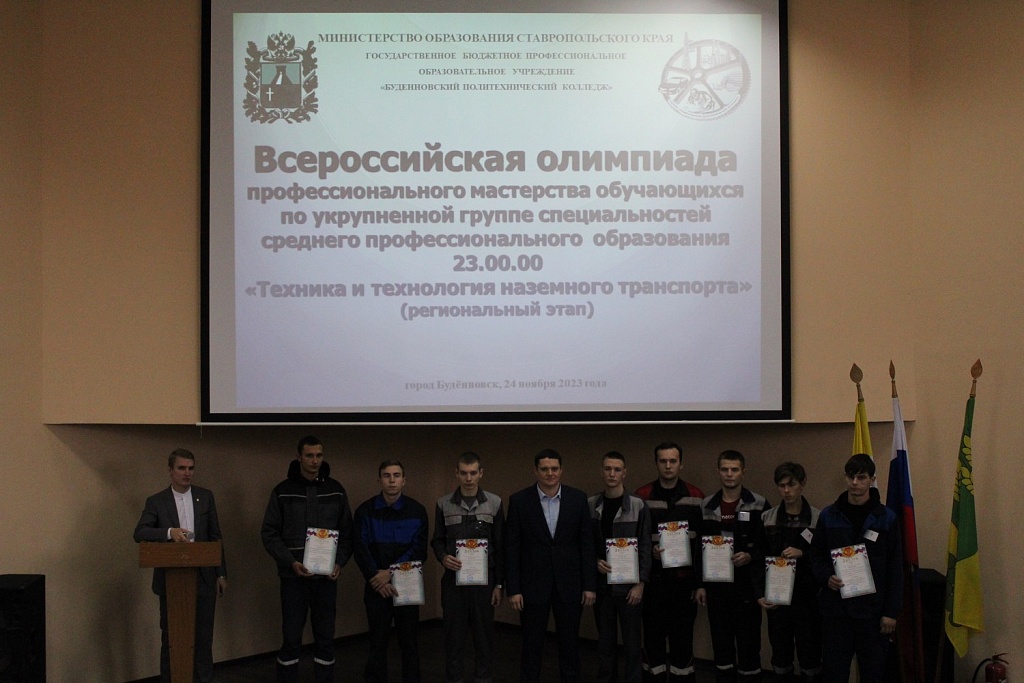 24 ноября 2023 года, на базе Буденновского политехнического колледжа состоялось закрытие регионального этапа Всероссийской олимпиады профессионального мастерства обучающихся по укрупненной группе специальностей среднего профессионального образования «Техника и технология наземного транспорта». Олимпиада проводилась с целью повышения качества профессиональной подготовки специалистов среднего звена. На церемонии закрытия с напутственными словами к участникам олимпиады обратился председатель жюри ,главный инженер АО « Прасковея» депутат Думы Буденновского муниципального округа Бережняк Александр Николаевич. И в завершении церемонии консультант отдела профобразования министерства образования Ставропольского края Кривченко Оксана Сергеевна наградила победителей олимпиады дипломами министерства образования Ставропольского края и вручила памятные подарки, а так же вручила кубок победителю.