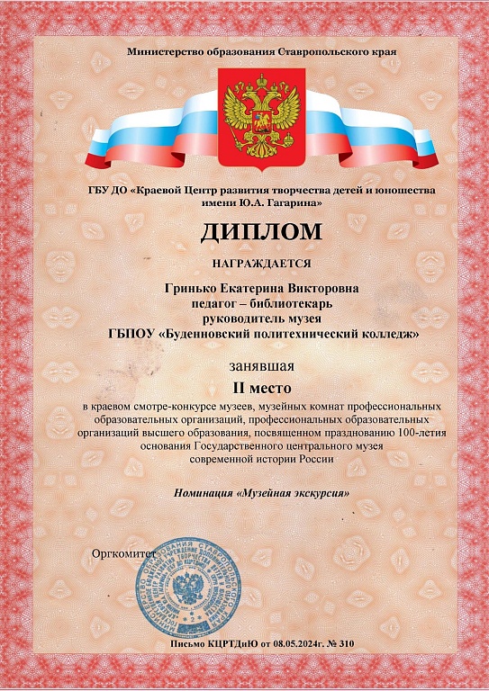 ГБУ ДО «Краевым Центром развития творчества детей и юношества имени Ю.А. Гагарина» подведены итоги краевого смотра – конкурса музеев, музейных комнат профессиональных образовательных организаций, профессиональных образовательных организаций высшего образования, посвященных празднованию 100- летия основания Государственного центрального музея современной истории России. Среди победителей Конкурса обучающийся 217 группы нашего колледжа Левинцов Артем, занявший 1 место в номинации «Музейная экспозиция, посвященная героям разных лет» и руководитель музея, педагог – библиотекарь Гринько Екатерина Викторовна, занявшая 2 место в номинации «Музейная экскурсия».