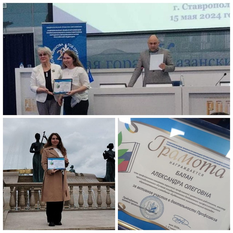 15 мая в г. Ставрополе в музейно – выставочном комплексе «Моя страна, моя история» состоялась объединенная конференция первичных профсоюзных организаций учреждений, подведомственных министерству образования Ставропольского края. Делегация нашего колледжа приняла участие в работе конференции. Приятным завершением этого большого мероприятия стало награждение активистов Профсоюза. Поздравляем Балан Александру Олеговну, члена профкома колледжа, мастера производственного обучения, награжденную Грамотой Ставропольской краевой организации профсоюза работников народного образования и науки Российской Федерации и денежной премией!