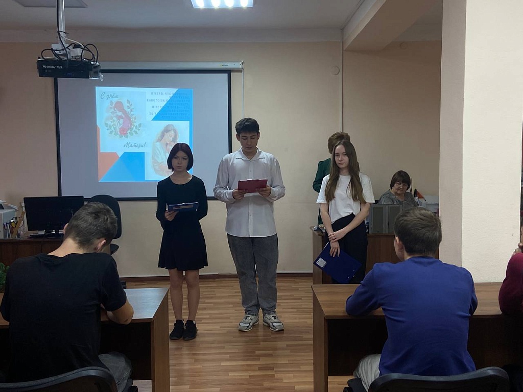 Петрушкин Станислав на фоне мелодии прочитал стихотворение С. Есенина «Письмо матери». Колодяжная Анастасия проникновенно прочитала стихи Расула Гамзатова «Мама» и Ирины Устиновой «В деревне старушка осталась вдовой…». Обучающаяся 213 группы Зимина Анна прочитала стихотворение раненого солдата ВСУ, попавшего в плен Российской армии. Ребята высказали своё мнение о прослушанном стихотворении.