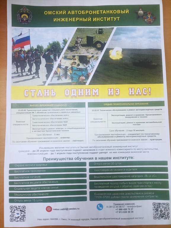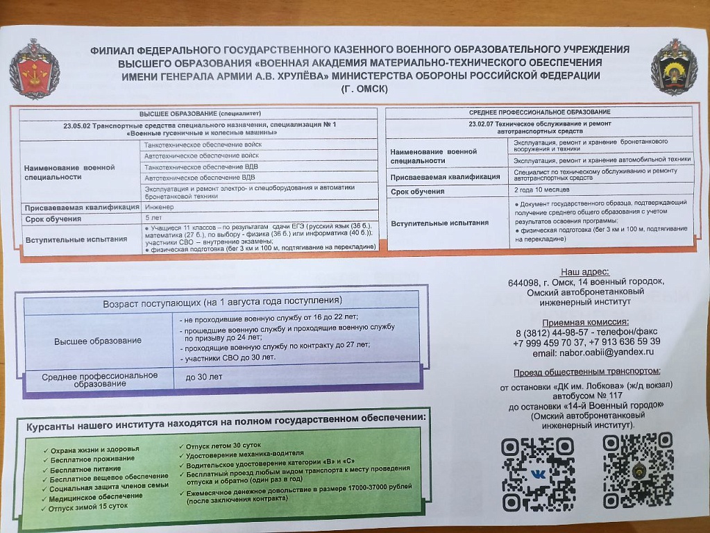 Омский автобронетанковый инженерный институт проводит набор курсантов для обучения по программе высшего образования по военным специальностям: "Танкотехническое обеспечение войск", " Автотехническое обеспечение войск", "Автотехническое обеспечение ВДВ".
