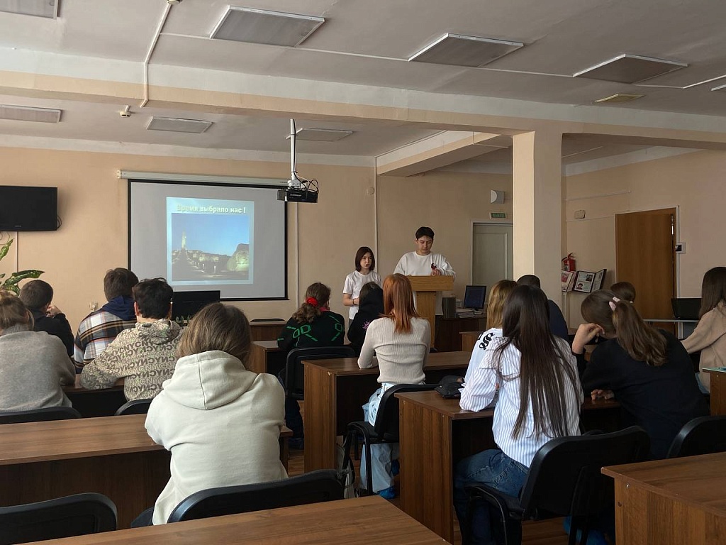 Для обучающихся 115 группы в читальном зале библиотеки колледжа прошел час Мужества «Время выбрало нас». Ведущие Петрушкин Станислав и Колодяжная Анастасия, обучающиеся 213 группы, напомнили о первых днях специальной военной операции 2022 года , когда внуки народа-победителя, внуки и правнуки героев Великой Отечественной войны снова поднялись на защиту нашей Родины.
