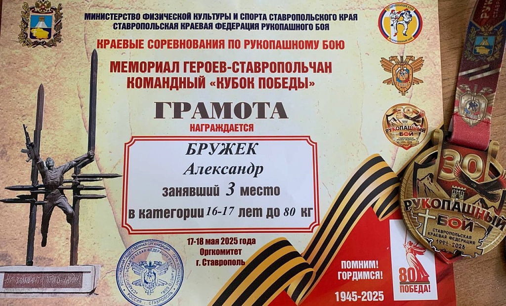Поздравляем нашего студента из 229 группы, Бружек Александра, занявшего 3 место на в краевых соревнованиях по рукопашному бою, в категории 16-17 лет. Которые прошли 17-18 мая Оргкомитет г. Ставрополь