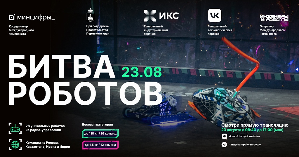 В первом отборочном этапе Чемпионата сразятся 28 команд из России, Казахстана, Ирана и Индии: 16 команд в рамках дисциплины «Битва роботов» в весовой категории до 110 килограмм и 12 команд в рамках дисциплины «Битва мини-роботов» в весовой категории до 1,5 килограмм. Мероприятие пройдет 23 августа 2025 г. с 10:30 до 19:00 (по местному времени) при поддержке Правительства Пермского края на территории УДС «Молот» по адресу: Пермский край, г. Пермь, ул. Лебедева, д. 13. Программой мероприятия предусмотрено два шоу: дневное (с 12:00 до 13:30) и вечернее (с 18:00 до 19:00).