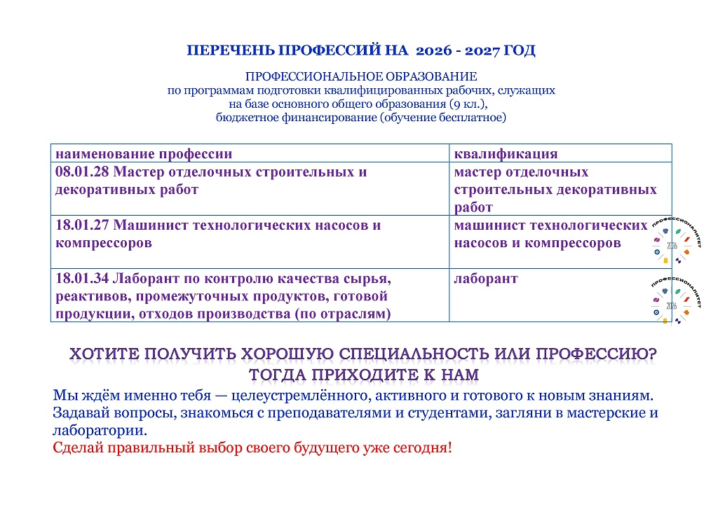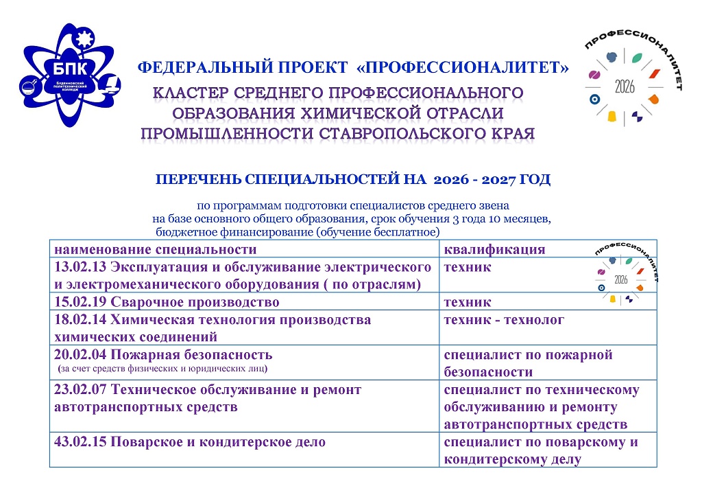 Перечень специальностей (профессий) на 2026 - 2027 год